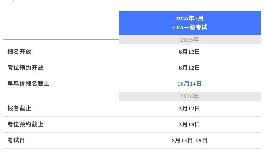 2026年5月CFA®(特许金融分析师)考试早鸟价报名将于2025年10月14日23:59(北京时间10月15日中午11:59)截止。