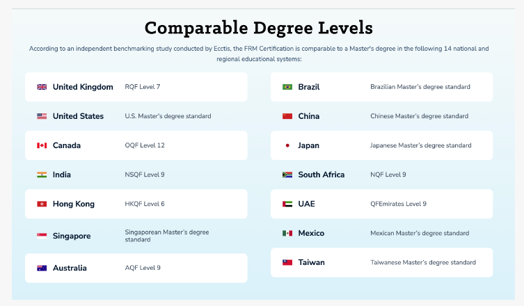 根据国际教育认证机构Ecctis研究,FRM认证在包括中国、美国、英国、日本在内的14个国家和地区被认定为硕士等值学历。