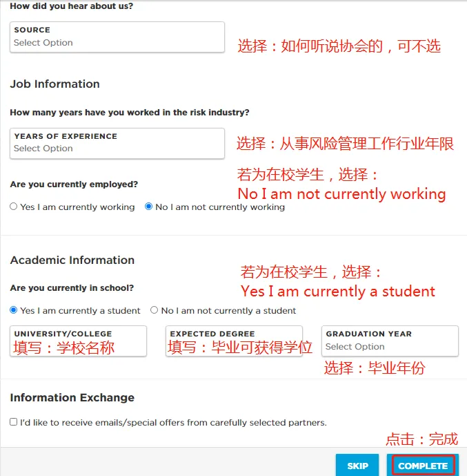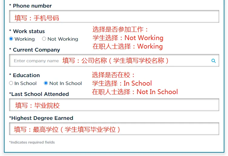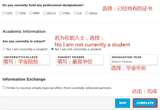 3.进入如下页面,继续填写相关信息,分为在校学生和在职人士,根据实际情况选择填写。