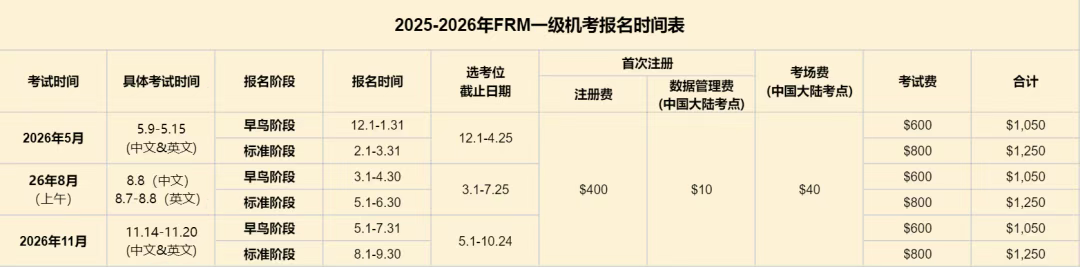 2026年FRM考试安排已确定,分别是5月、8月、11月考期。各个考期安排如下: